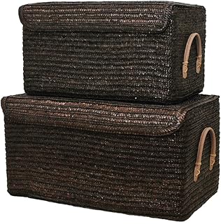 【メルカド かご収納雑貨の店】 ストロー製フタ付きかご収納バスケット ダークブラウン 内布:無地柄 L&LL 2個セット [MERCADO]