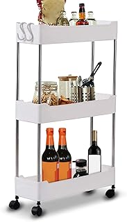 KEISHINキッチンワゴン キャスター付き 14-17cm幅伸縮可能 ホーム収納カート おしゃれ 隙間収納ラック 水切りかご 物置バスケット 移動可能 取り付け簡単 工具不要(幅14-17cm/長さ40cm/三段)