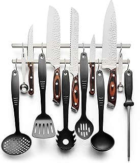 Modern Innovations 16インチ ステンレススチール 磁気ナイフバー 8つの金属フック付き – 多目的使用 壁掛けナイフホルダー ナイフ磁気ストリップ キッチン用品ホルダー 磁気ツールホルダー