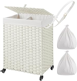 Greenstell 洗濯物かご 車輪付き 取り外し可能なライナーバッグ2枚 合成籐 手織り 洗濯物かご 蓋とハンドル付き 折りたたみ式で簡単に設置 (ホワイト)